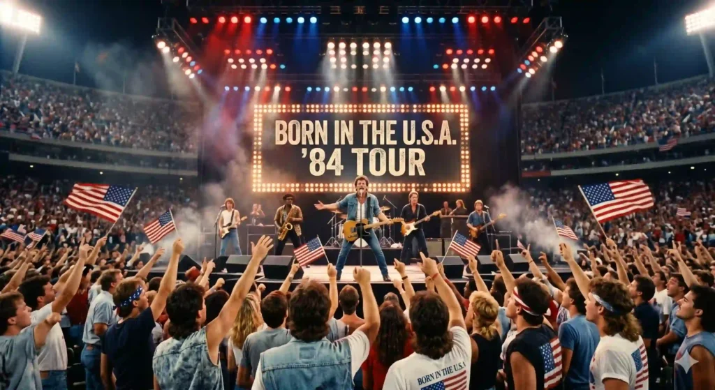 スタジアムで星条旗を振り回しながら「Born in the U.S.A.!」と拳を突き上げる群衆。
