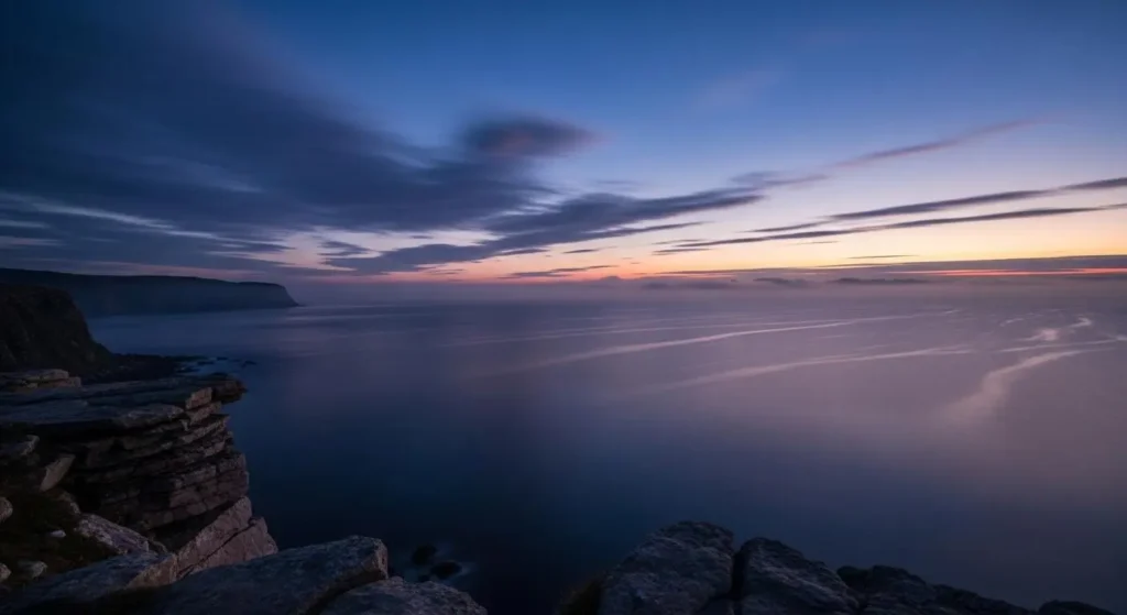 - 目的地のない旅路の果てに見える、夜明け前の海の色