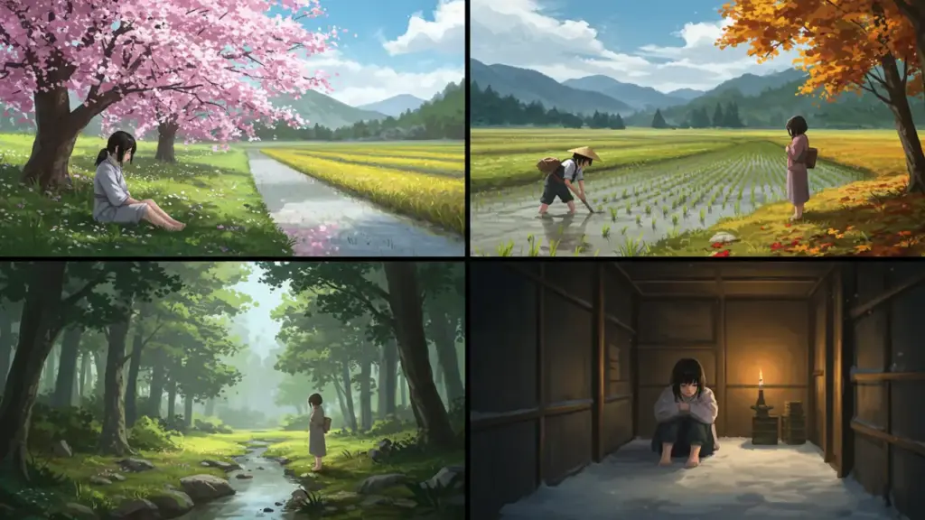 特に、「盆過ぎには雪もちらちら」というフレーズは、季節の移り変わりとともに少女が感じる孤独感や厳しい生活環境を暗示しています。赤ん坊をあやす優しさの裏で、自分自身の未来への不安や悲しみを抱える彼女の姿は、時代を超えて多くの人々の心に響くのです。